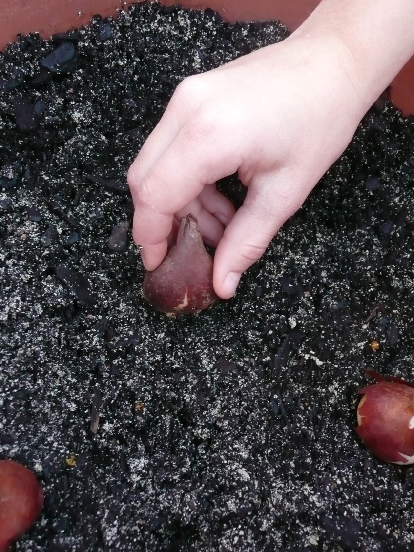Put in a plant label so that you know what types of tulips you have planted and water them in with a watering can.