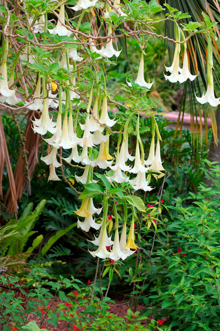 Angels trumpets (brugmansia) are native to the subtropical forests of Brazil and Chile. There they grow beneath other trees in an unruly and tangled mess of branches, illuminated by those sensational flowers.