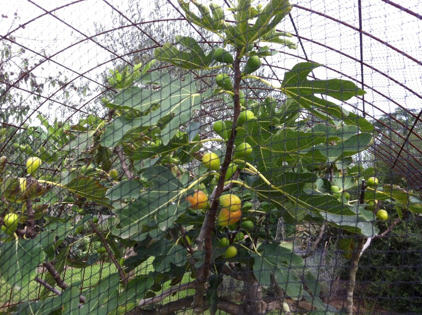 Plastic snakes do a similar job as birds of prey. We throw them up on branches within the fig trees to act as a backup to our fake owl. A model black cat