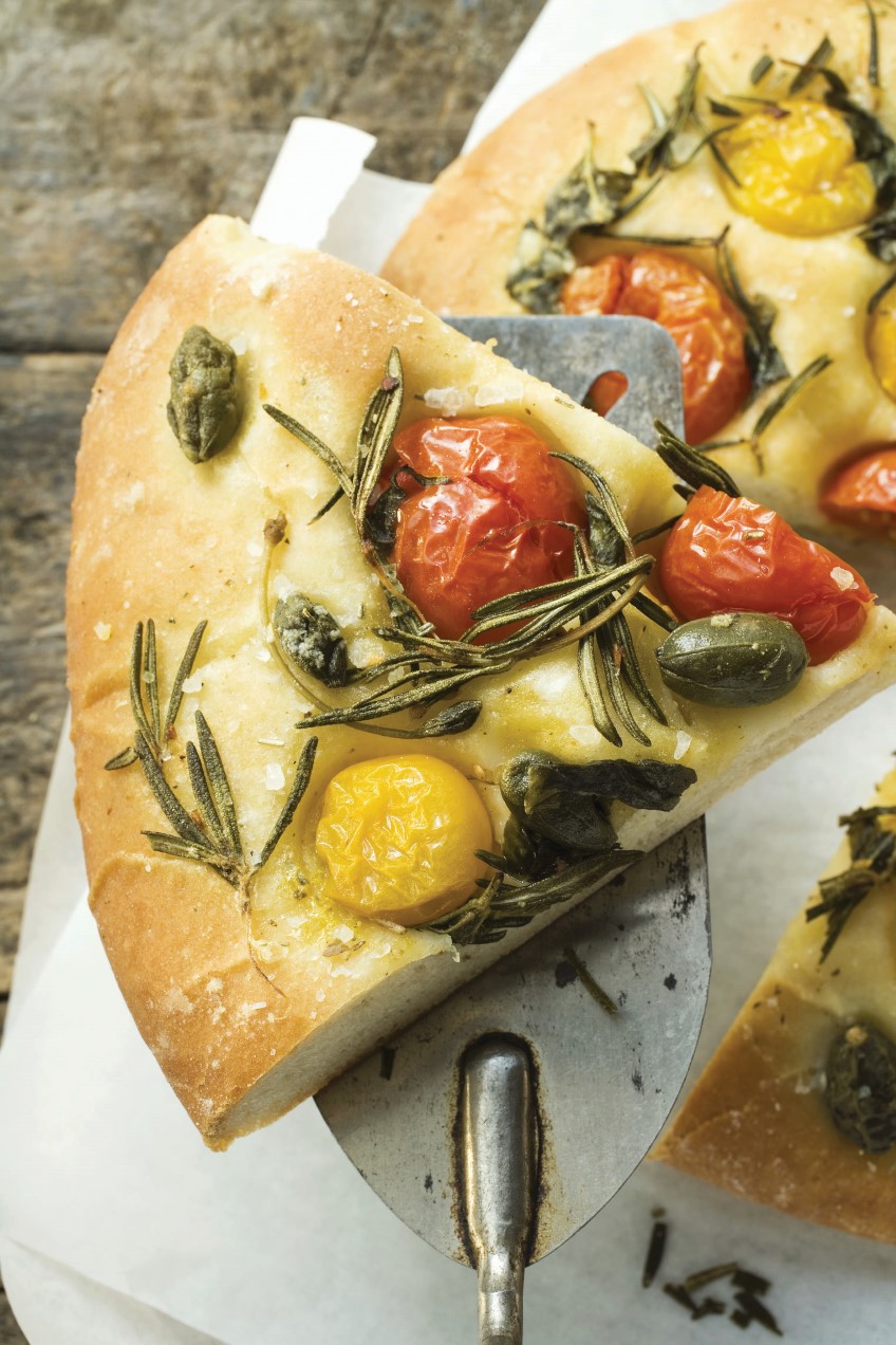rosemary and plenty of salt flakes. Bake in hot oven for 10 minutes, until base is crisp. Cut into thin slices and serve with drinks. For a meal version,