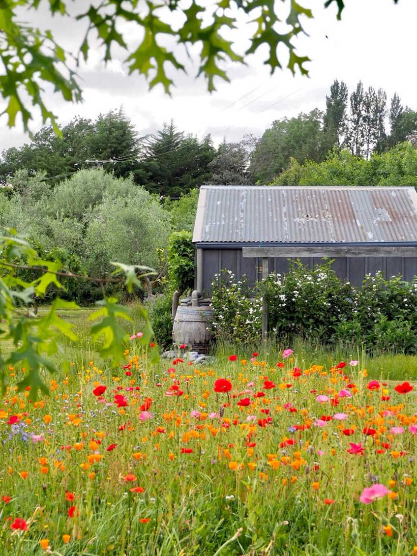 is carpeted in spring by wildflowers, with a succession of bulbs and plenty of cheery poppies. Berry canes scramble up supports around the shed and