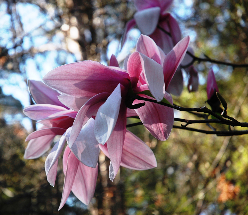Magnolias start flowering in the winter, and one of our favourites, ‘Star Wars’, which is a fairly big tree of about 6 – 10 metres, has large, floppy,