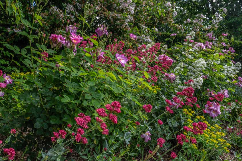 areas. To create this look in this bed, I first cut back the roses, then cut the valerian quite harshly. The perennials were removed and divided. Iris