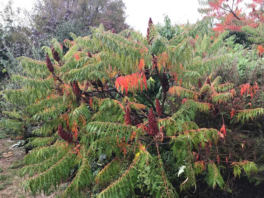Great foliage in summer and amazing autumn tones, this hardy shrub suckers to form a stand of unruly stems, 3m high and 5 wide. I prune to highlight its