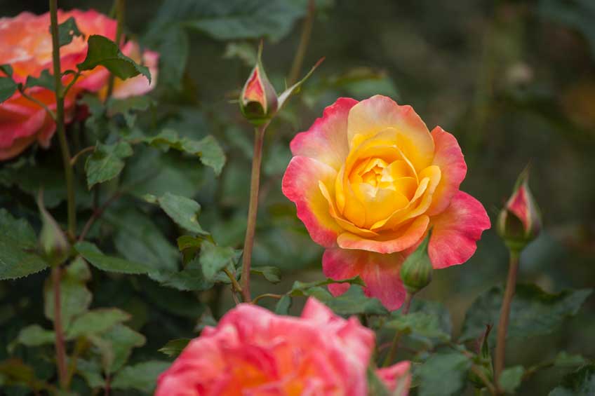 roses. Exceptionally healthy year round, they boast medium-sized flowers in a spectrum of cream, golden yellow flushed with vermillion and various