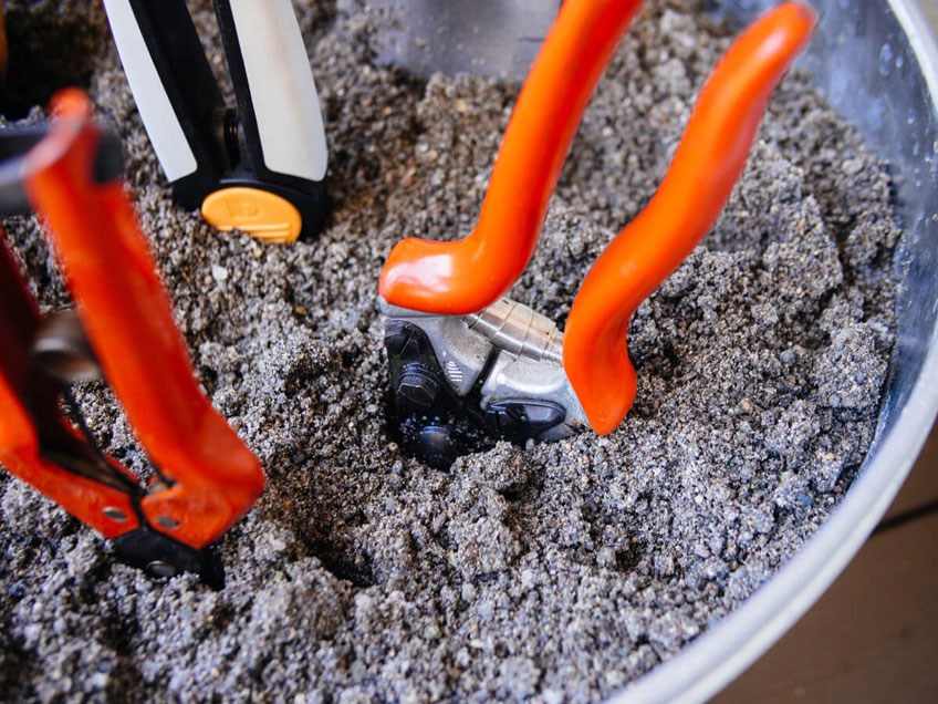 the garden. When you’re done using your tools, brush off any debris and then stick the tools (blades or tines down) into the sand. The grains help