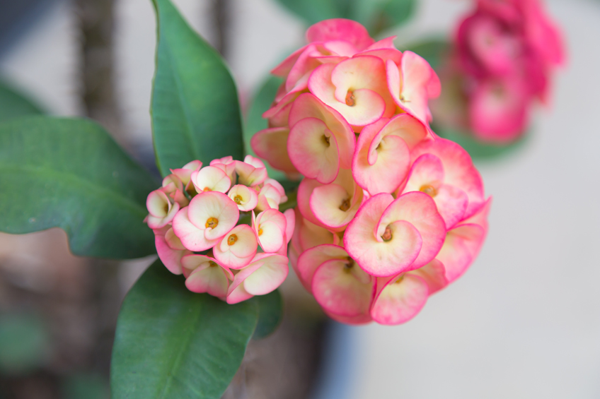 Identify: Crown of Thorns offers pretty flowers with no pest and disease problems. The scalloped petals in fiery reds, pinks and oranges