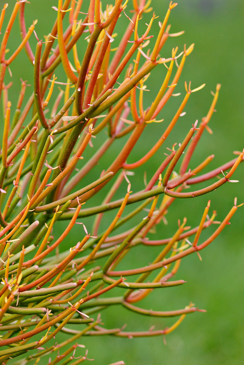 Identify: Also called red pencil tree, this is a striking succulent shrub of pencil-thin stems that will form a dense thicket. The red-gold
