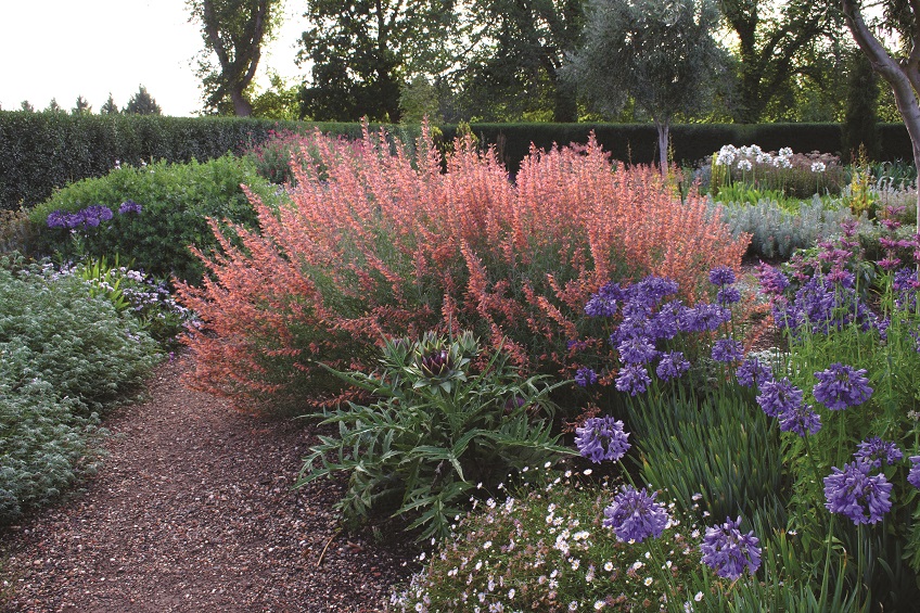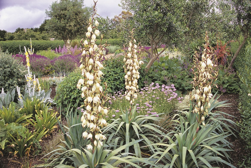 Bold use of yucca, Mexican lily and artichokes provides punchy focal points amongst waves of flowers. Photo - Lambley's Nursery