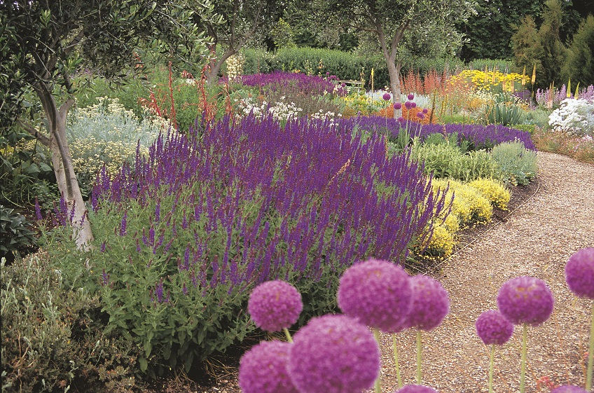 The Dry Garden at Lambley features silver olive trees and a painterly combination of dry-loving flowers. Growing centre front is the purple Salvia nemorosa. Photo - Lambley's Nursery