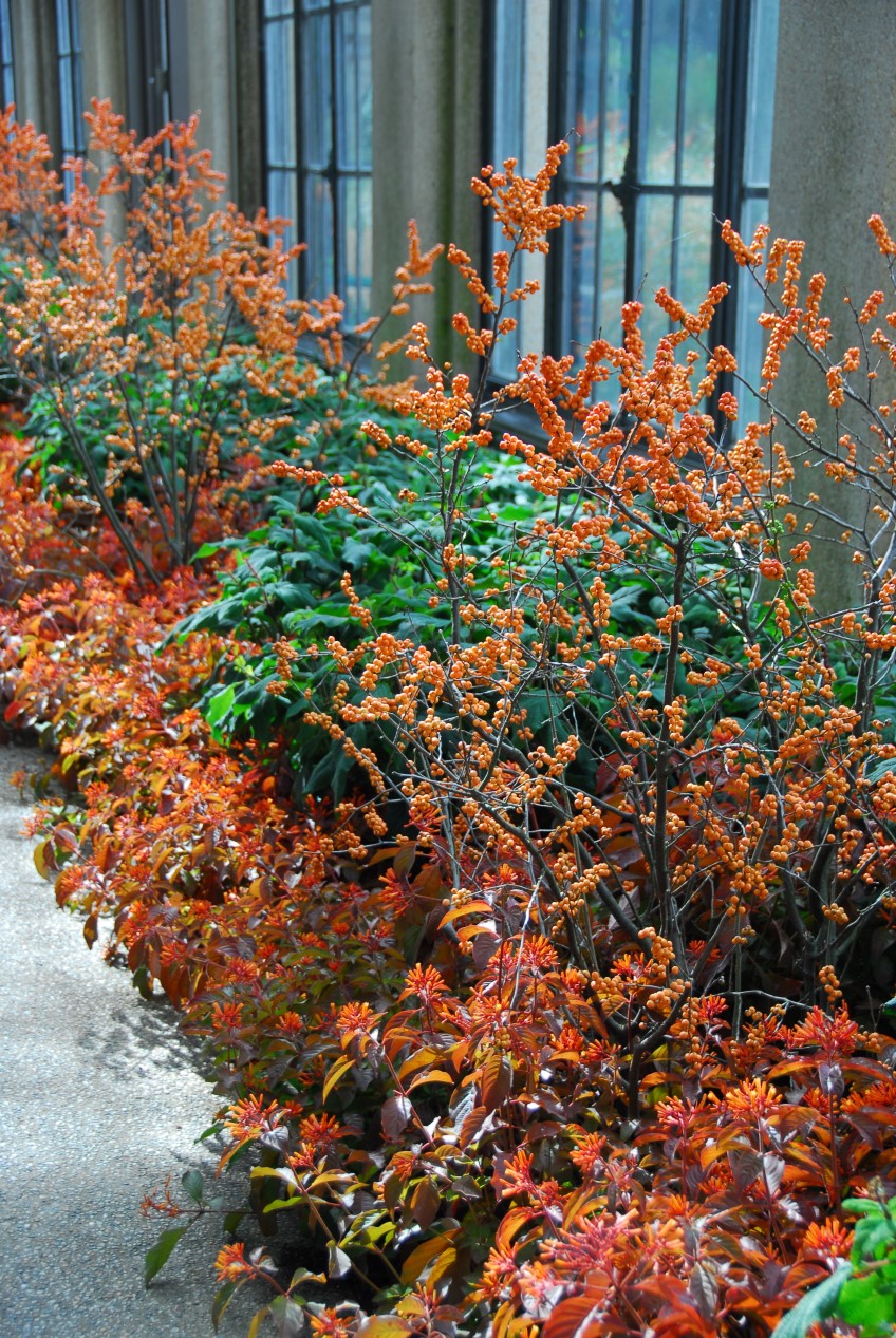 On one autumn visit to Longwood, I was impressed by a stunning orange-berried form of the deciduous holly (Ilex cornuta) planted with an orange-flowered