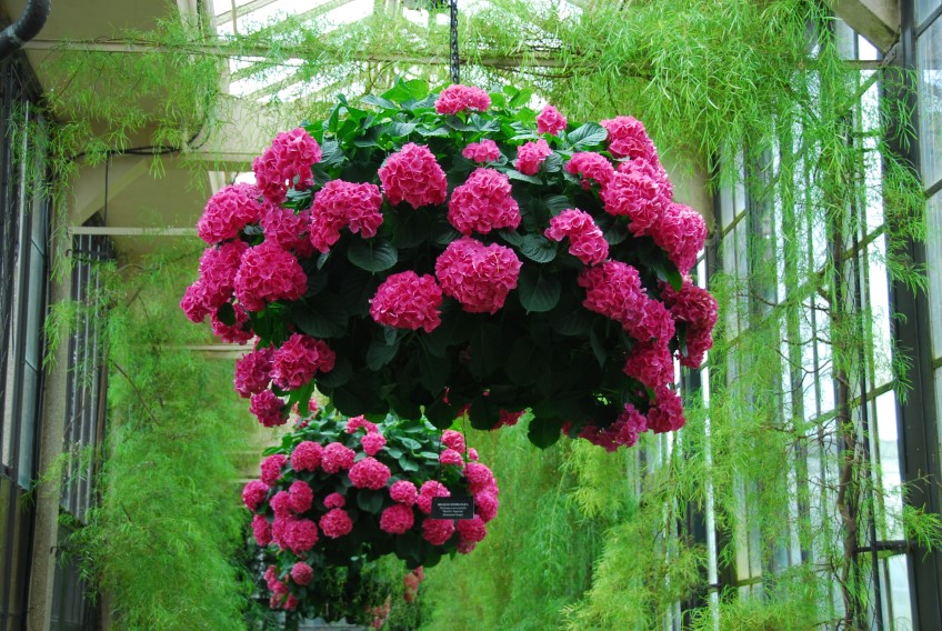 Hanging baskets of pink hydrangeas are fringed with Acacia congata 'Lime Magik' grown as a climber. Photos - Michael McCoy