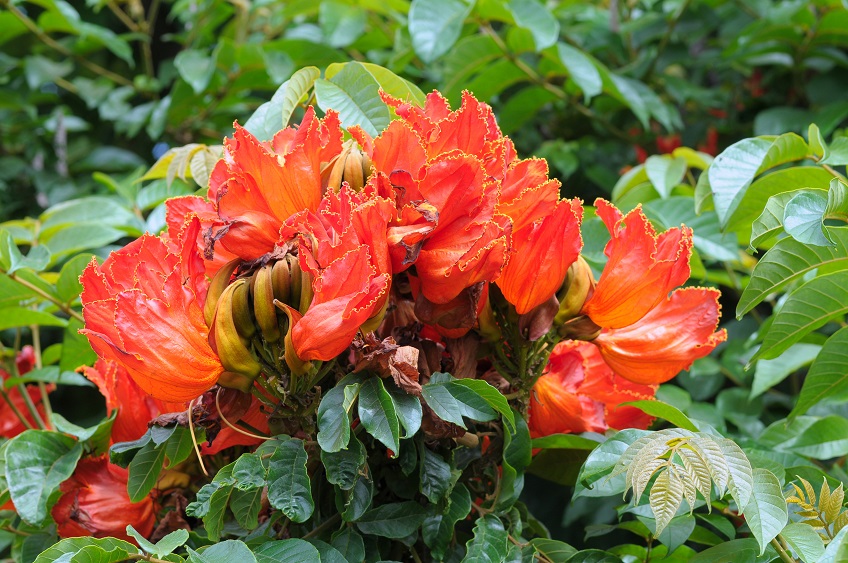 tree. We know this as the African tulip tree, Spathodea campanulata, and the Mauritians are right, it is nothing if not flamboyant, with giant