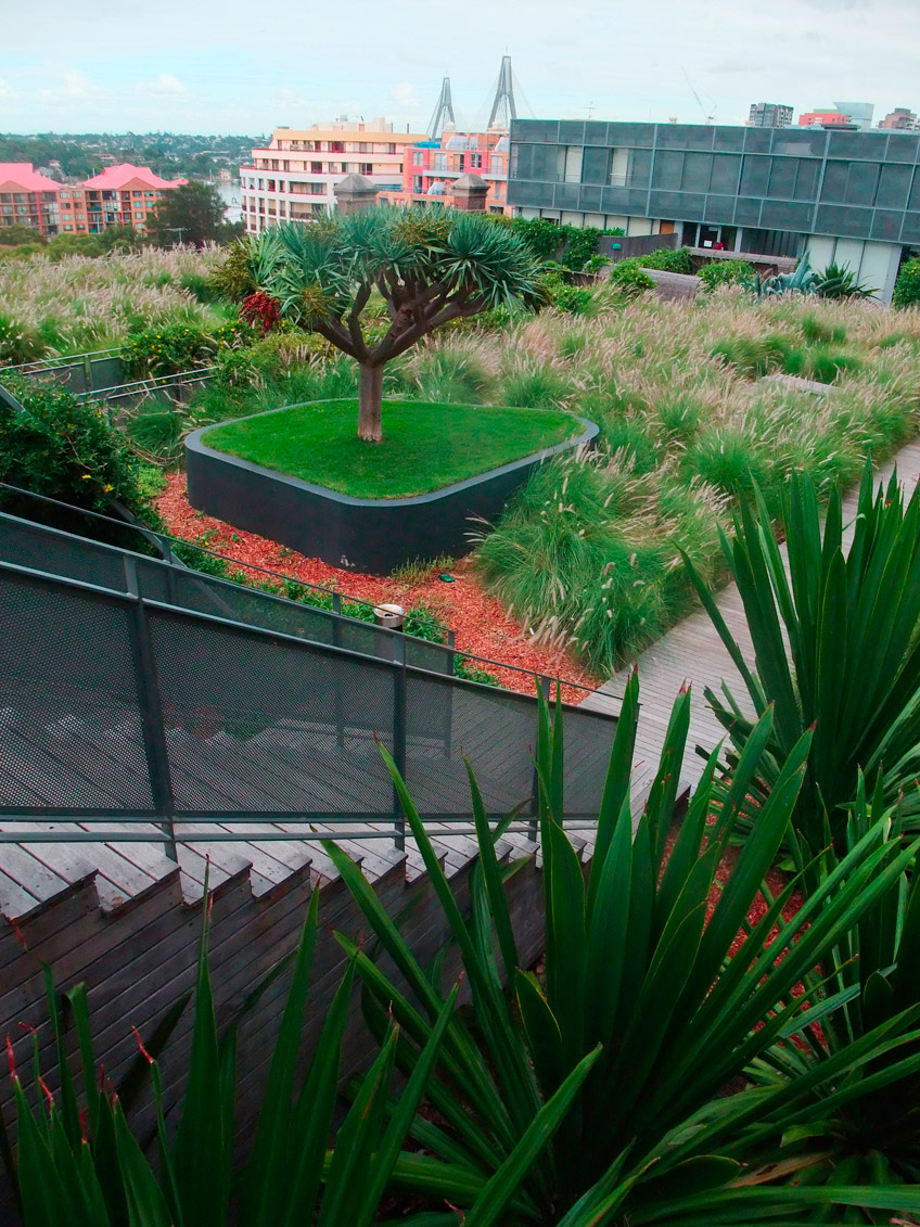 range in scale from a little 10 square metre green roof, to something that aims to replicate Sydney’s original forest canopy four storeys up, or Sydney’s