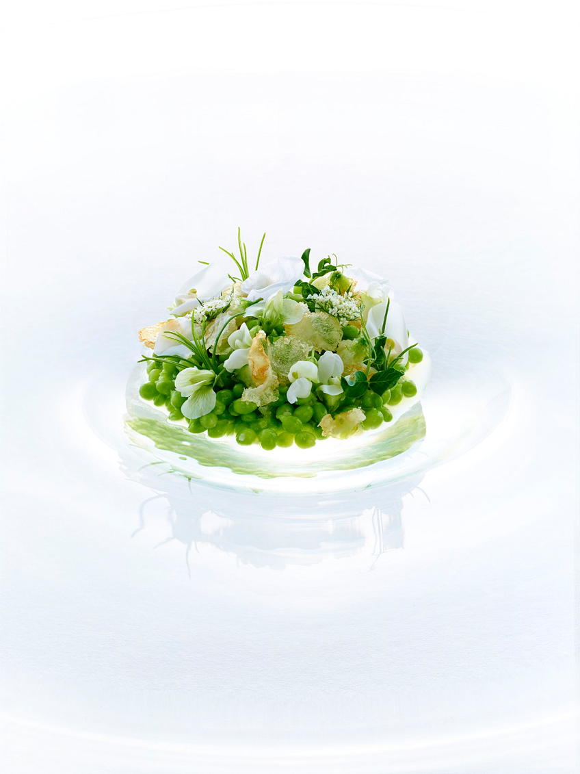 A celebration of the pea: 'Garden peas, cultured butter, sea salt, crisp pea blossoms'. Photo - Organum, Murdoch Books.