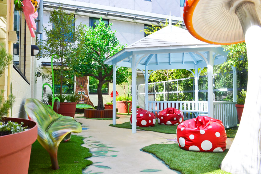 it into a place of respite for children and their families. We created a lawn using synthetic grass, murals to represent an enchanted forest and put