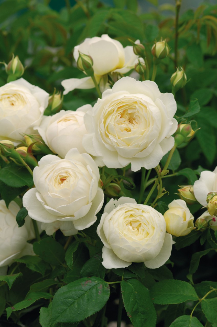 A David Austin-bred pillar or low climbing rose to 1.5m, this has pale lemon buds that open to cupped white blooms. The intense musk fragrance won it the