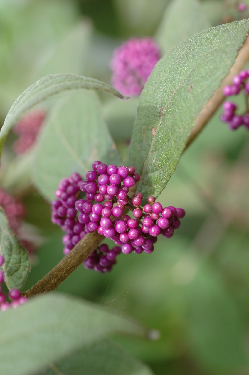 Description: a vase-shaped deciduous shrub, grown for its outstanding purple berries, which cluster along the stems in autumn, following
