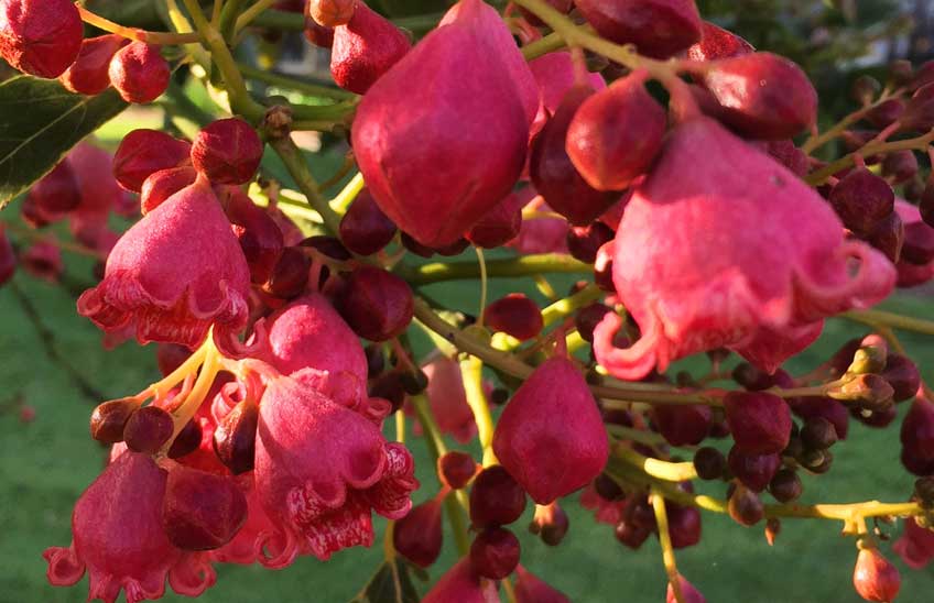 I stumbled upon a grafted native tree called Brachychiton ‘Jerilderie Red’. It has glossy green leaves all year round and red, bell-like bracts/flowers