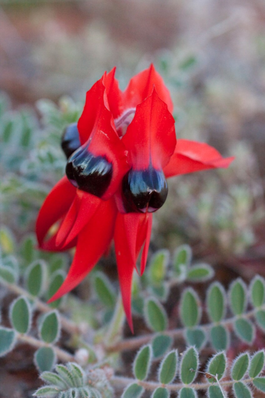 Description: annual with deep red pea-shaped flowers with a glossy black central boss, appearing after rain on trailing 1-2m stems covered with hairy grey