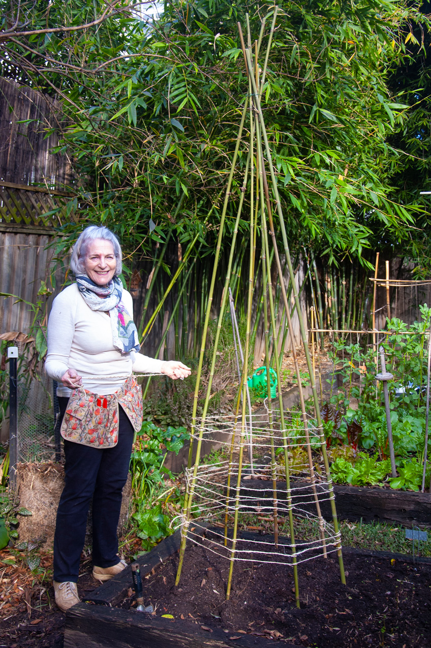 If space permits, a series of tripods made with cane bound with string, can support one tomato, one bean and one cucumber.
