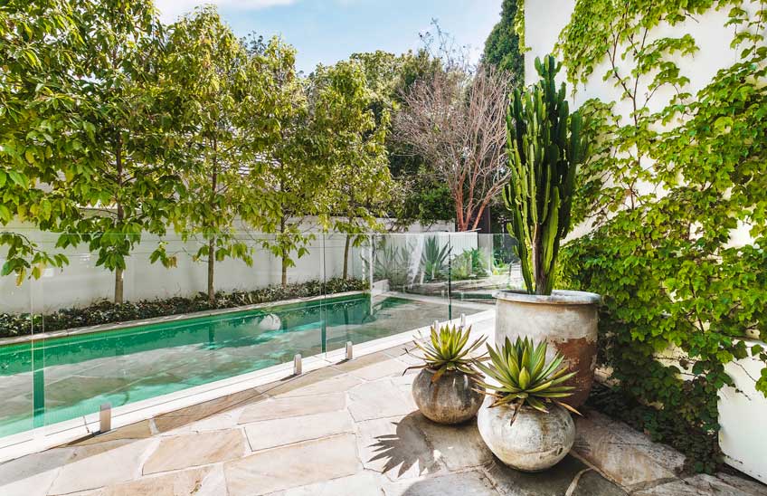 the pool, the sandstone flagging presents in a crazy-paving format suggesting informality, its larger size also making the space appear bigger.