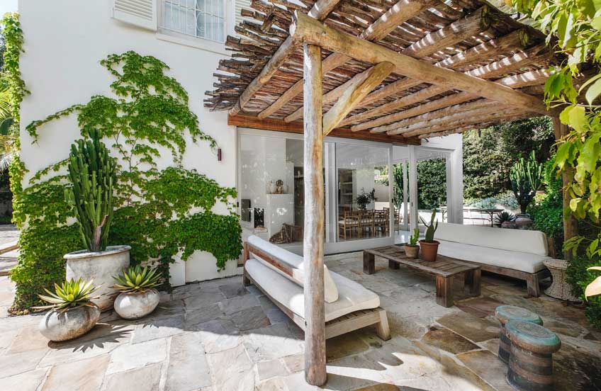 Meanwhile, a pergola in rough-cut hardwood with a latte pole roof, abutting the living areas and accessed through sliding glass doors, adds to a sense