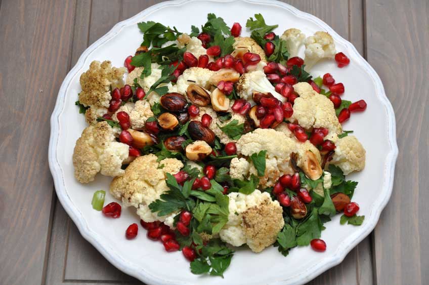 Assemble the salad by tossing the fresh herbs with the warm cauliflower, pomegranate and nuts. Drizzle the dressing over the top.