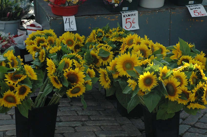 In high summer Scandinavia, gardens are heavy with the weight of pears, apples - and all varieties of berries. Markets are a cornucopia of fruits and vegetables. In the main square in Uppsala, market stalls are piled high with chanterelles (wild mushrooms), which are collected from the forests at this time of year and sold in the main square along with the raspberries, blueberries and strawberries. The Helsinki market on the harbour front is best and biggest of all: more gold and black chanterelles; flower stalls with an abundance of flowers, especially sunflowers; stalls selling traditional fish, salmon, herrings, and other tasty delights including reindeer sausages, fish burgers and big pots of mixed fish hotpot that smell tempting; and of course plenty of berries.