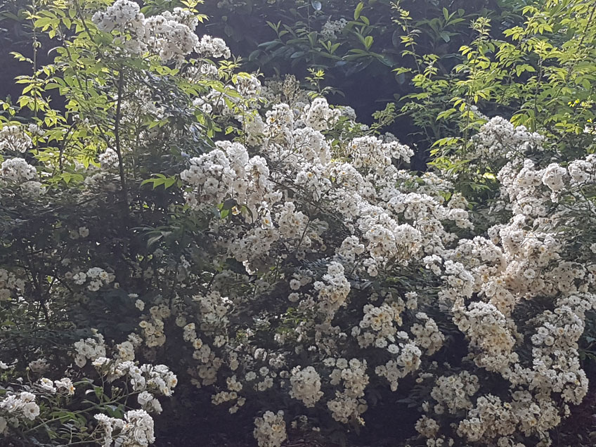 This rose is very good for covering sheds and climbing over walls, which it does very effectively and very quickly. The flowers are like apple blossoms,