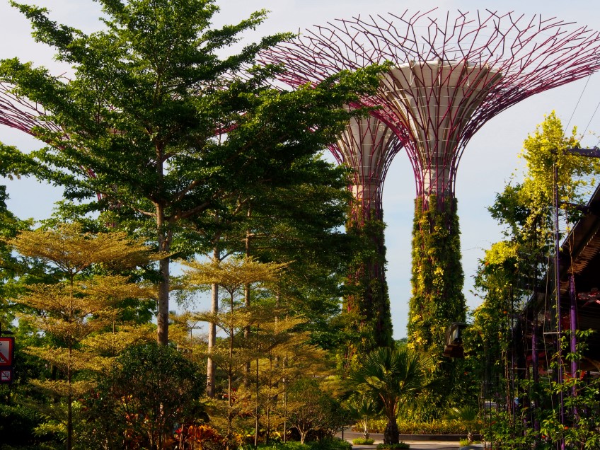 The Gardens by the Bay 'Supertrees' tower over the natural trees and are clothed in walls of plants. They are lit at night, powered by solar panels hidden in the 'treetops'. Photo - Robin Powell