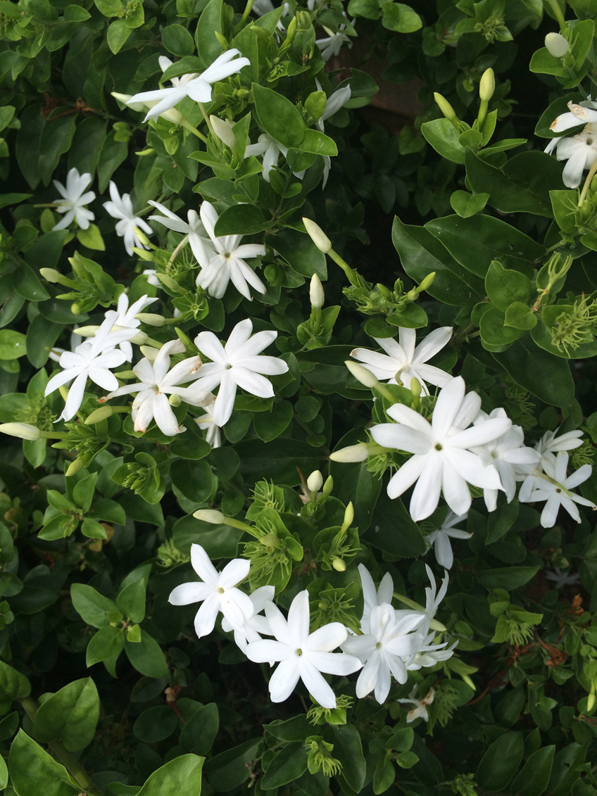 Common jasmine, J. polyanthum, is a much-loved vine with a rampant habit that can become weedy. The fragrance is strong, too strong for some.