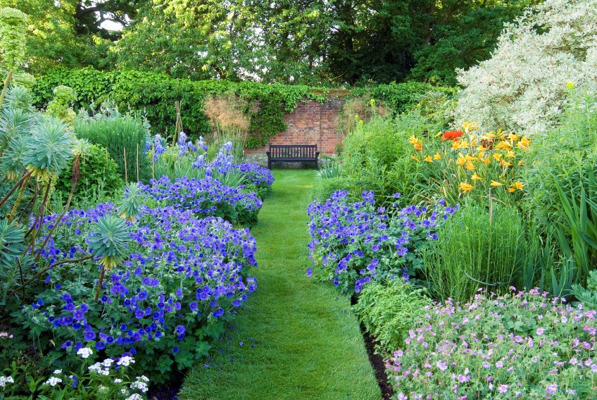 layout of intersecting squares outlined in buxus. These are planted with a romantic mix of colourful blue flowers, blended with violet verbena, mauve