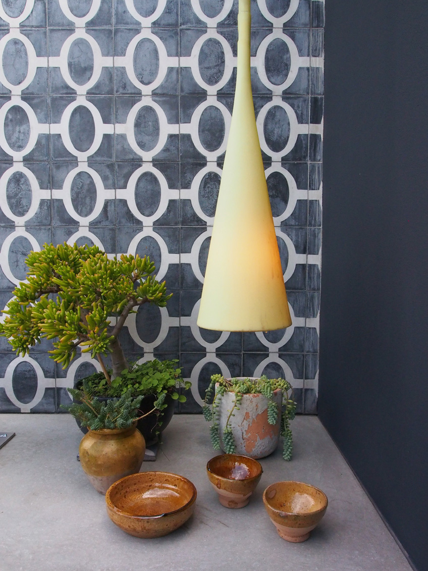 tones are used in the planters, pots and sofas, brightened with occasional pops of yellow. On the floor, textures and visually interesting tiles have