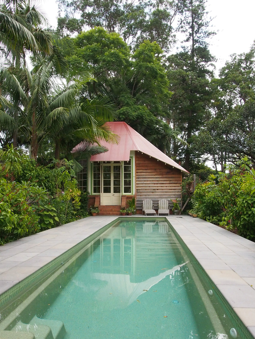 staghorns near the outdoor shower by the new poolhouse. The cohesiveness of the materials and the colours – a palette of cream with accents of apple
