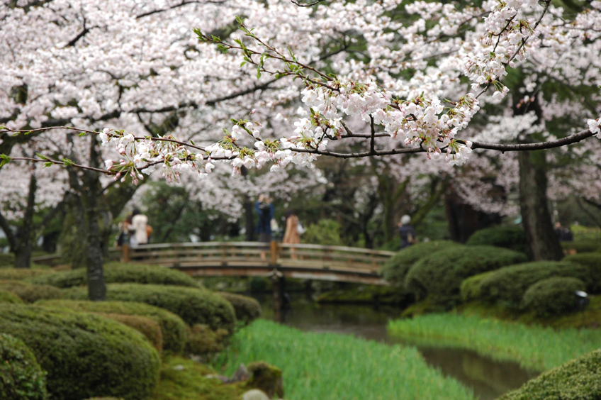 A bridge under cherry blossoms in Kenrokuen. Photo - Linda Ross