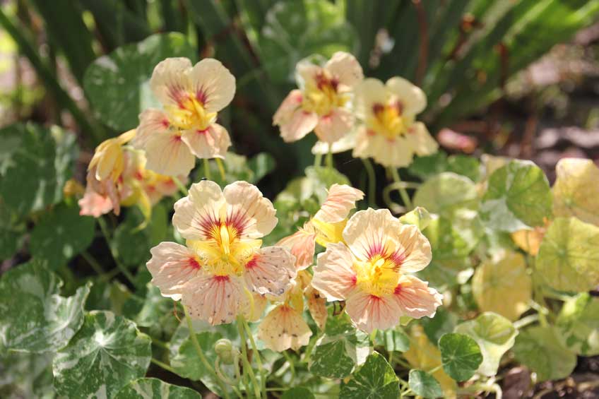 Old-fashioned nasturtiums (Tropaeolum majus), with handsome variegated leaves are easy to grow in any well-drained soil. ‘Alaska Mix’ has cream-marked