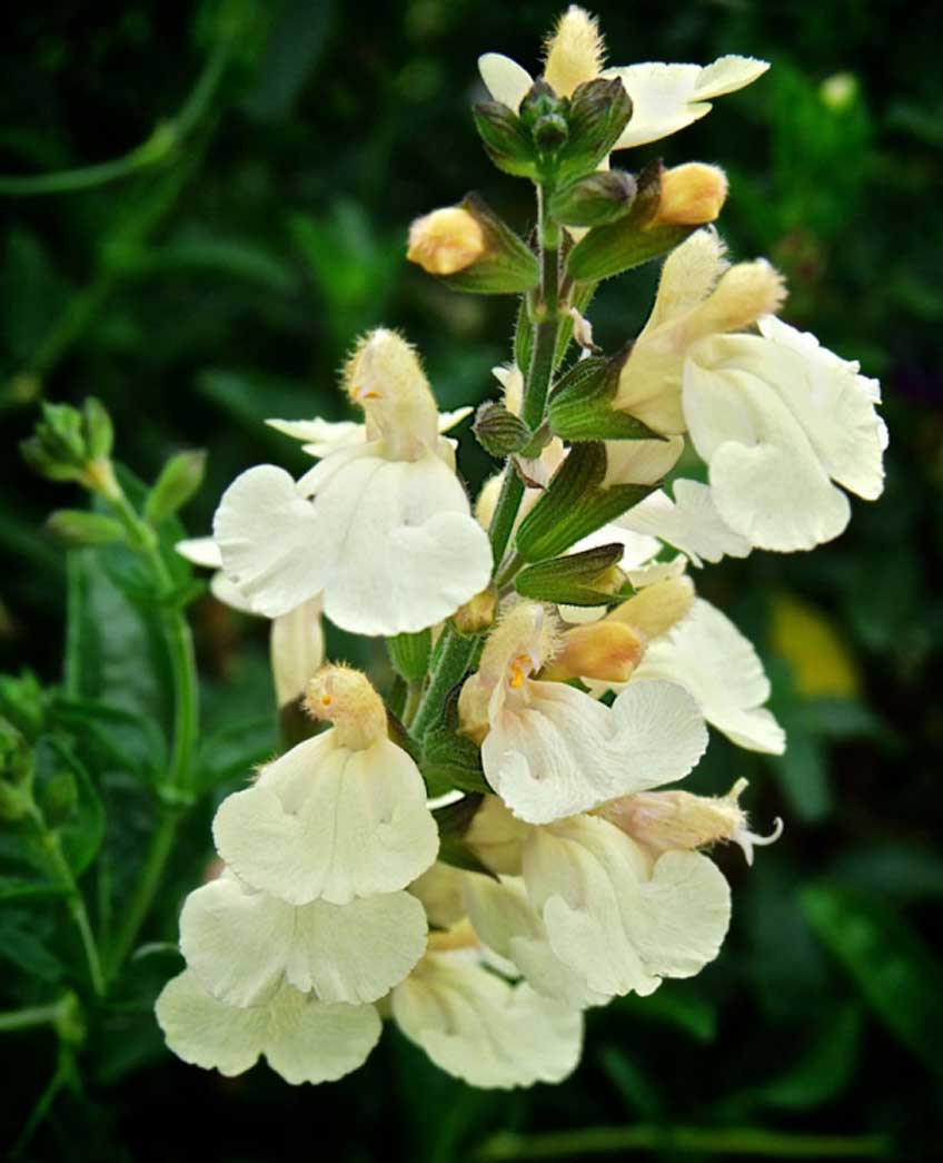 Flowering mid-to late-summer, Salvia ‘Clotted Cream’ throws up loose spires of creamy white flowers from a clump of aromatic green foliage. It will reach