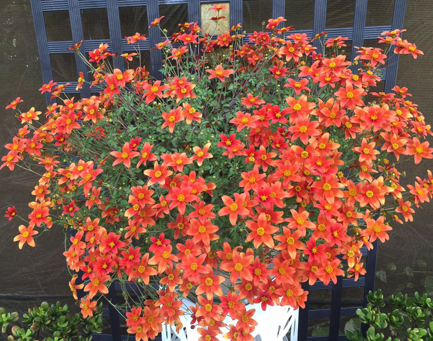 Bidens ‘Campfire’ displays rich orange and yellow bi-colour blooms. This hardy perennial is heat and drought tolerant once established and offers a burst