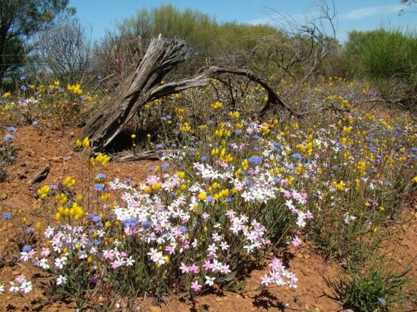 and blue dampiera (Dampiera wellsiana) creating an amazing sea of colourful flowers.