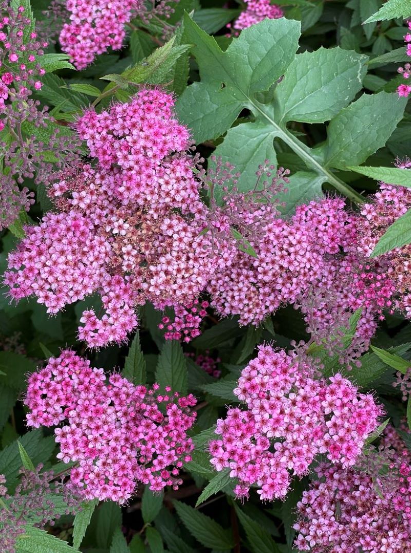 Widegravel paths invite a leisurely stroll through the garden; an iris in bloom; the rose arbour underplanted with a mix of perennials; Spiraea japonica
