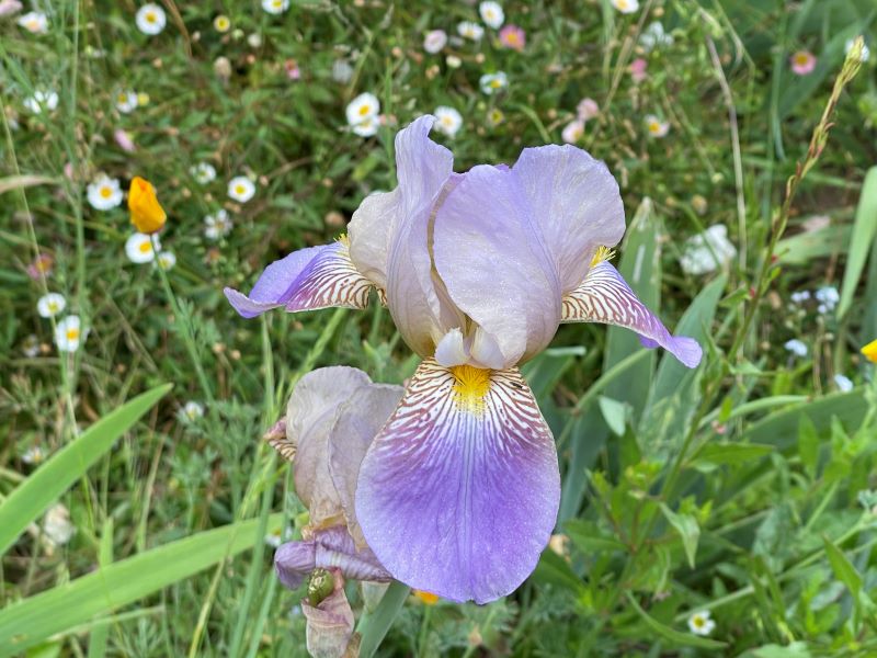 The roses were in brilliant, fragrant bloom. Beneath them, bearded irises stood proud above blue and white nodding aquilegias. Sweet peas scrambled between the roses and lounged over the paths. Clumps of blue forget-me-nots had white species gladiolus surrounded; and everywhere sparks of bright orange Californian poppies sparkled in the sunshine. Marian says she hates to see bare earth, and there’s not a skerrick to be spotted beneath the tumble of plants.