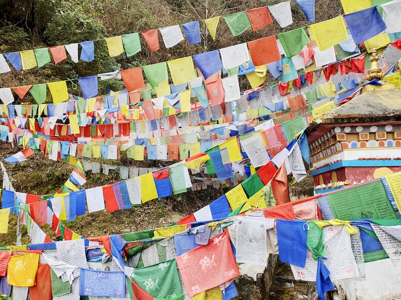 Colourful prayer flags flutter on hilltops, bridges, and along mountain trails.