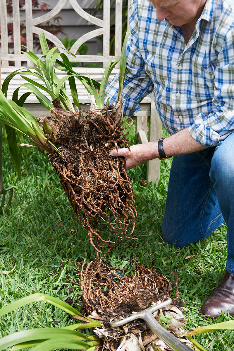 Push the handles apart to prise the roots and bulbs into two smaller sections. Don’t worry if up to 15 per cent of the roots are lost in the process.
