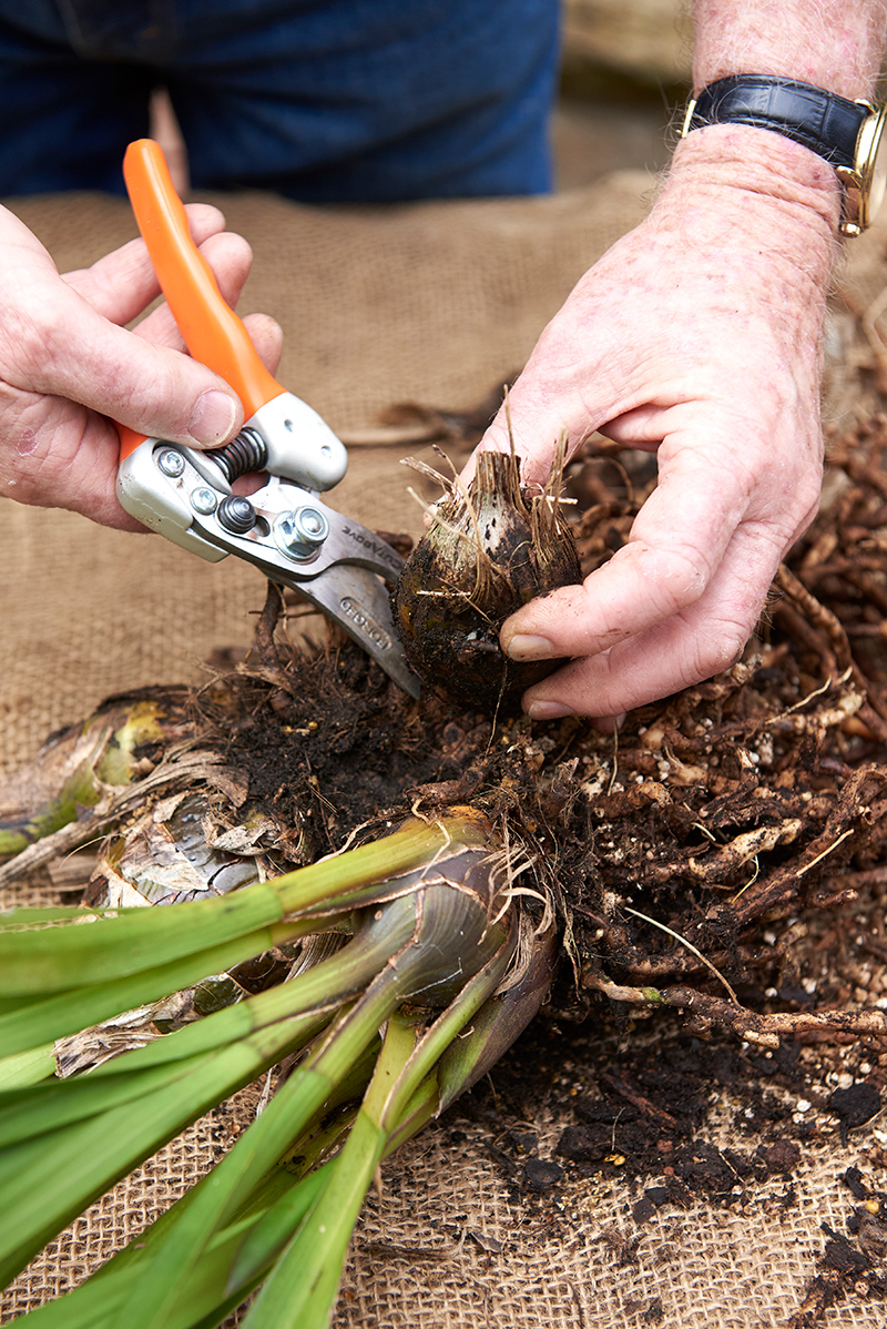 Carefully prune or twist off any dead, black, spongy or diseased bulbs. Take your time removing old, unproductive bulbs and roots, leaving 4 to 5 thick, healthy roots that are grey to creamy white. Trim these roots back by 40 to 50 per cent.