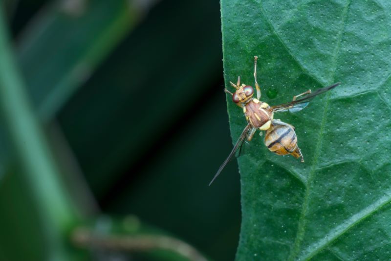 2. Baiting to attract both male and female fruit fly. The bait is painted onto stems and leaves but timing is critical. Apply the bait before flies are about and repeat after rain.