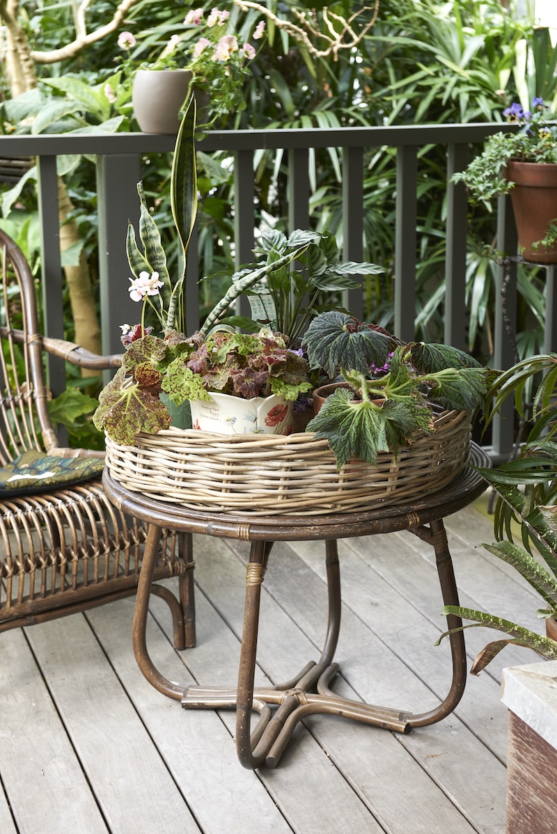 Choose plants with a variety of textures for foliage interest, and include flowering plants like African violet, nodding violet (Streptocarpus), hoya, flamingo flower, or peace lily.