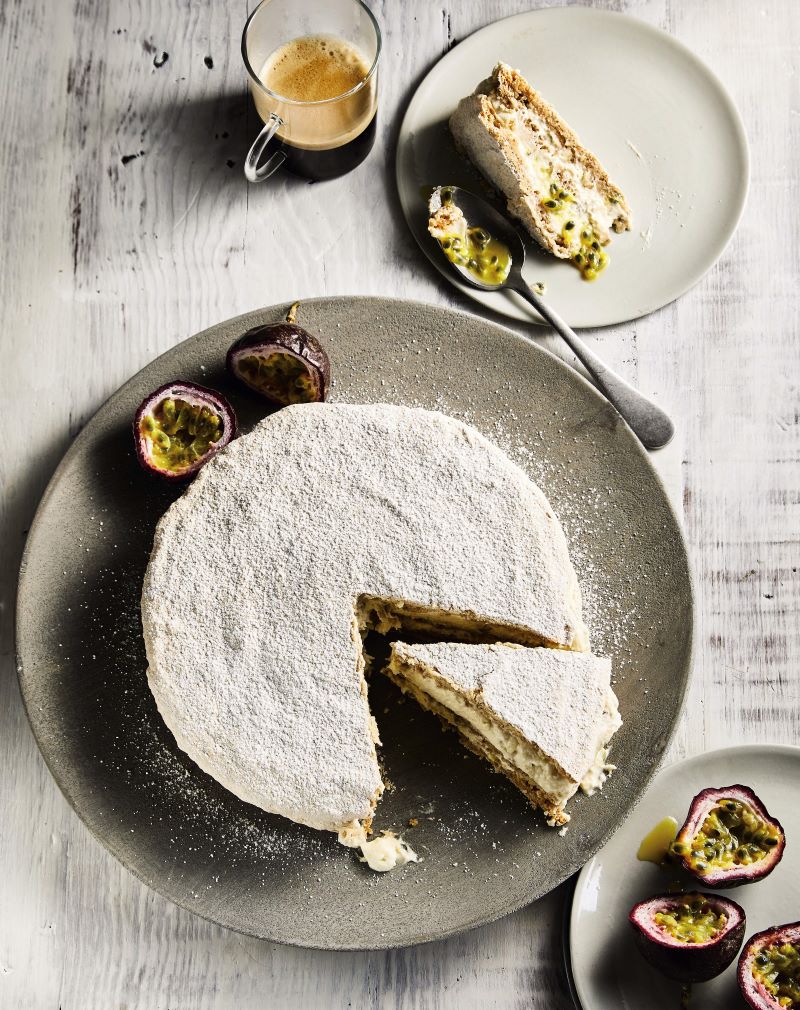 6 Add the honey to the cream and whip the cream to very firm peaks. Refrigerate until you are ready to assemble. Fold two-thirds of the banana/passionfruit mix slowly into the cream. You want the filling to still hold its shape. Decide whether you need to add the rest of the banana/passionfruit mix.