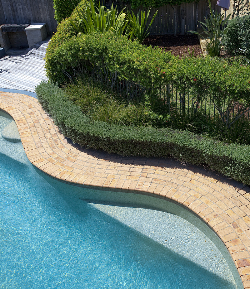 In this native scheme, callistemon and westringia are neatly trimmed to follow the pool’s curves, softened by tufts of lomandra, with callistemon also screening the pool fence.