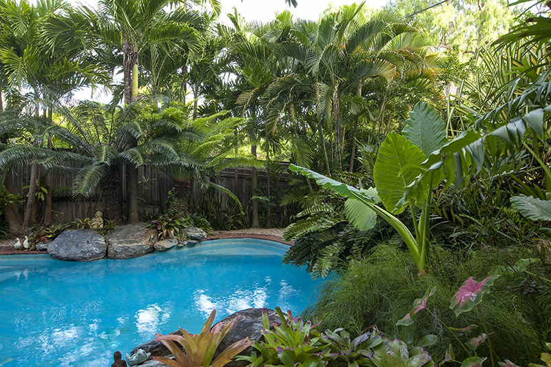 Giant alocasia, bromeliads, palms and the cardboard palm (Zamia furfuracea), combine for a lush, tropical planting style, creating an inviting poolside retreat.
